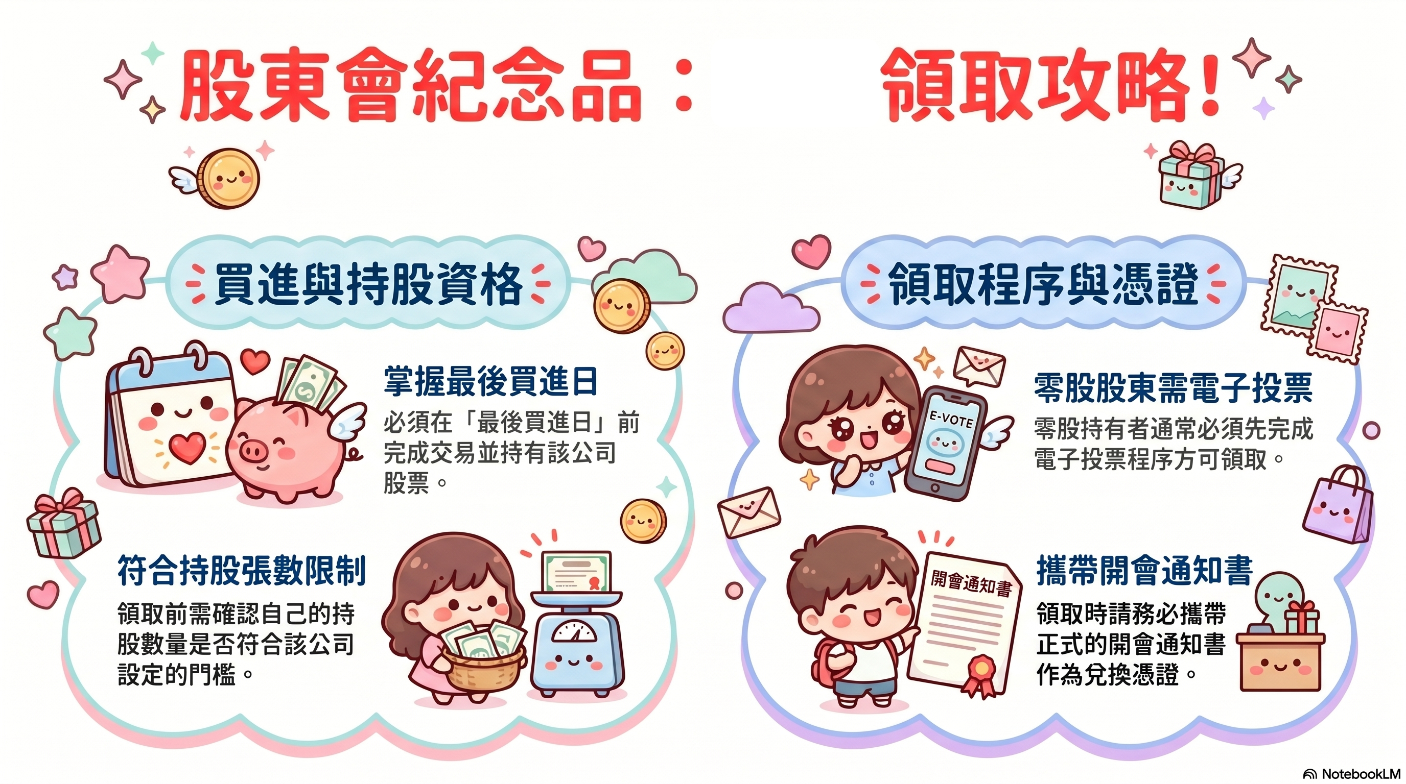 一般而言,只要成為該公司的股東,就有機會領取股東紀念品,即使是零股股東同樣也是如此。不過實際規定仍因公司而異,部分公司會需要在電子投票平台上完成投票,或親自出席股東會才能領取。