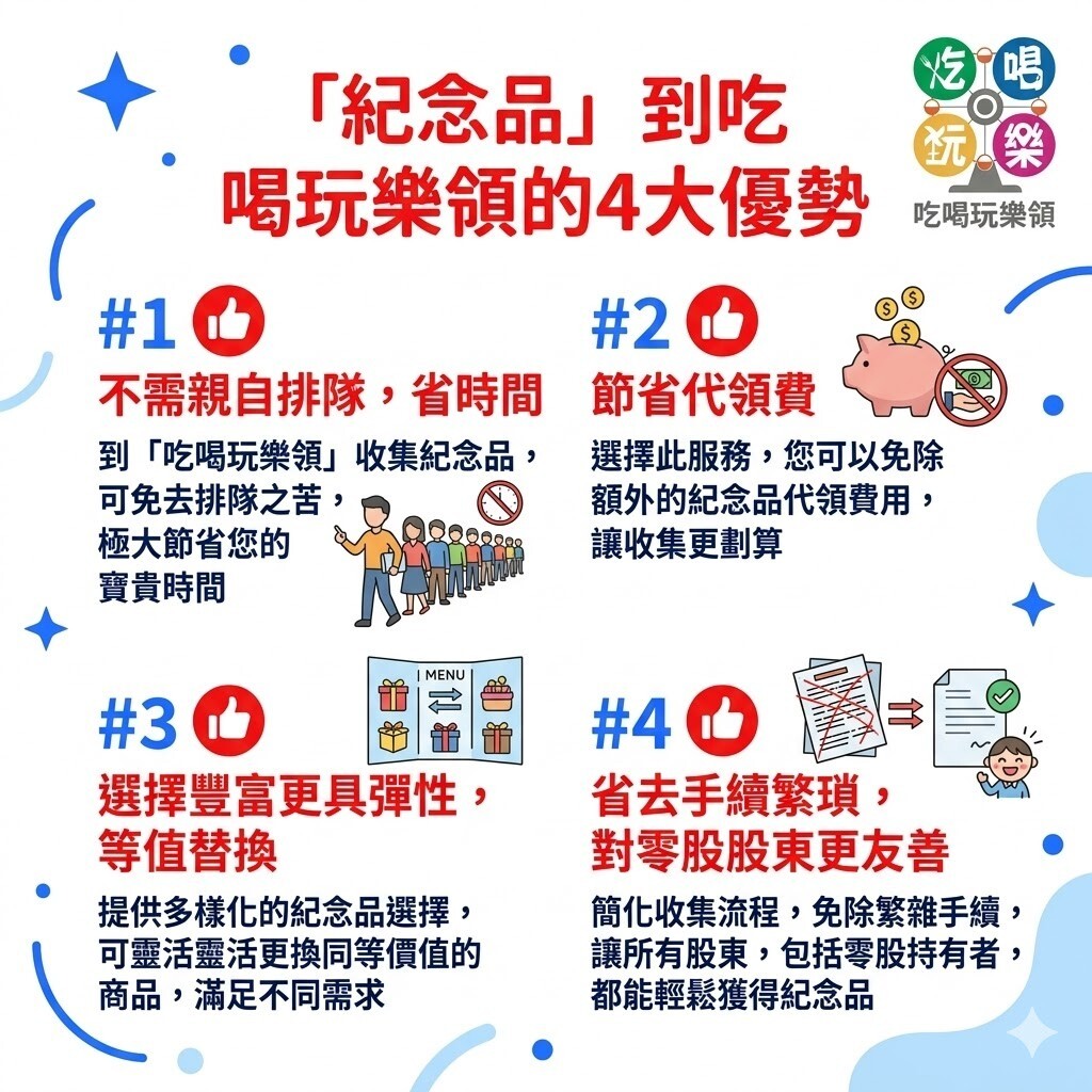 為什麼要選擇來吃喝玩樂領股東紀念品?股東紀念品對於大多數人而言,多追求是否具「實用性」,尤其現代人生活忙碌,若能省時省力享受到紀念品更是小確幸。