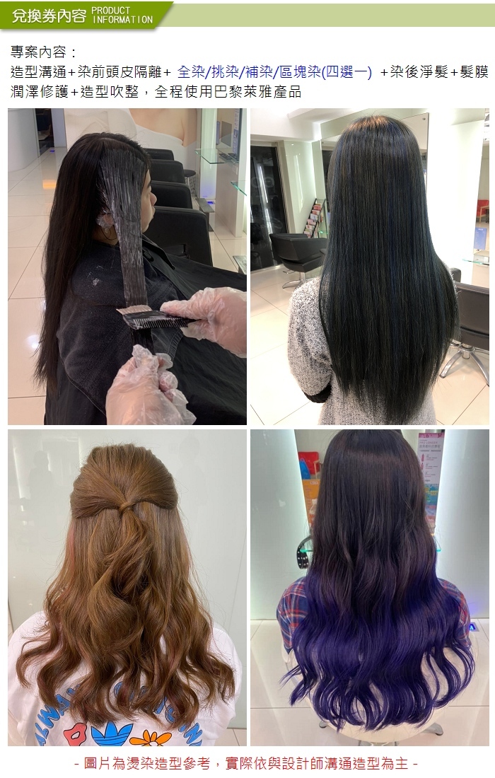 2.專案內容包含:造型溝通 + 染前頭皮隔離 + 全染/挑染/補染/區塊染 四選一 + 染後淨髮 + 髮膜潤澤修護 + 造型吹整,全程使用巴黎萊雅產品(以上內容限乙次使用完畢)