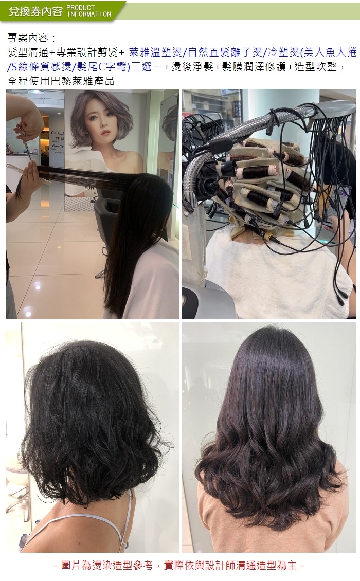 2.專案內容包含:髮型溝通 + 專業設計剪髮 + 萊雅溫塑燙/自然直髮離子燙/冷塑燙(美人魚大捲/S線條質感燙/髮尾C字彎) 三選一 + 燙後淨髮 + 髮膜潤澤修護 + 造型吹整,全程使用巴黎萊雅產品(以上內容限乙次使用完畢)