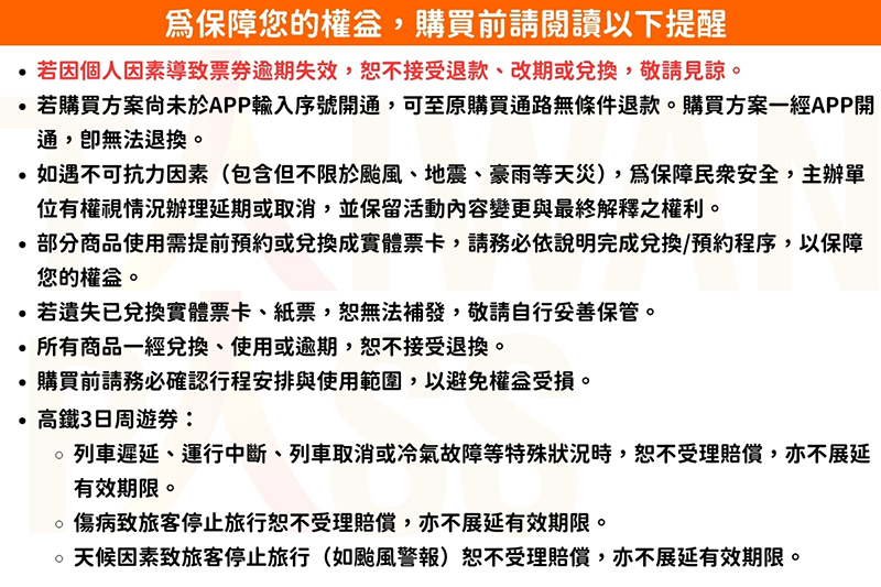 列車遲延、運行中斷、列車取消或冷氣故障等特殊狀況時,恕不受理賠償,亦不展延有效期限。