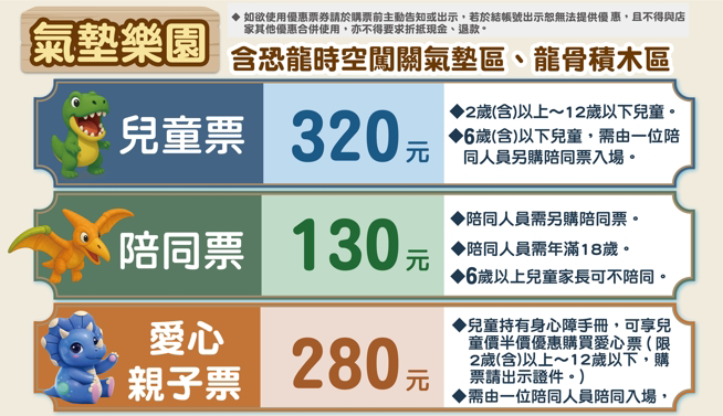 以上優惠限使用於闖關氣墊全區+龍骨積木區使用,平日不限時,假日限3小時。