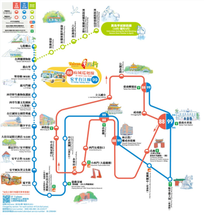 台灣好行「88安平線」與「99台江線」,提供串連台南市主要交通運輸場站至重要觀光景點(赤崁樓、億載金城、安平古堡、安平樹屋、孔廟、延平郡王祠、四草紅樹林生態區等及延伸至七股鹽山)間的無縫隙旅遊服務;引領您品嚐台南道地小吃等各項美食,以快速接駁的方式,讓遊客盡情暢遊舊府城市區熱門旅遊景點。