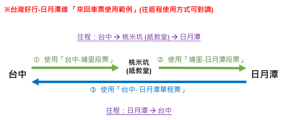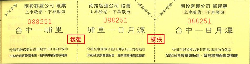 ※憑段票乘車者,行程中可選擇其中一站(埔里、桃米坑、大雁、魚池、日月老茶廠),下站一次,不另外收費;車票使用後,下車前須繳回。