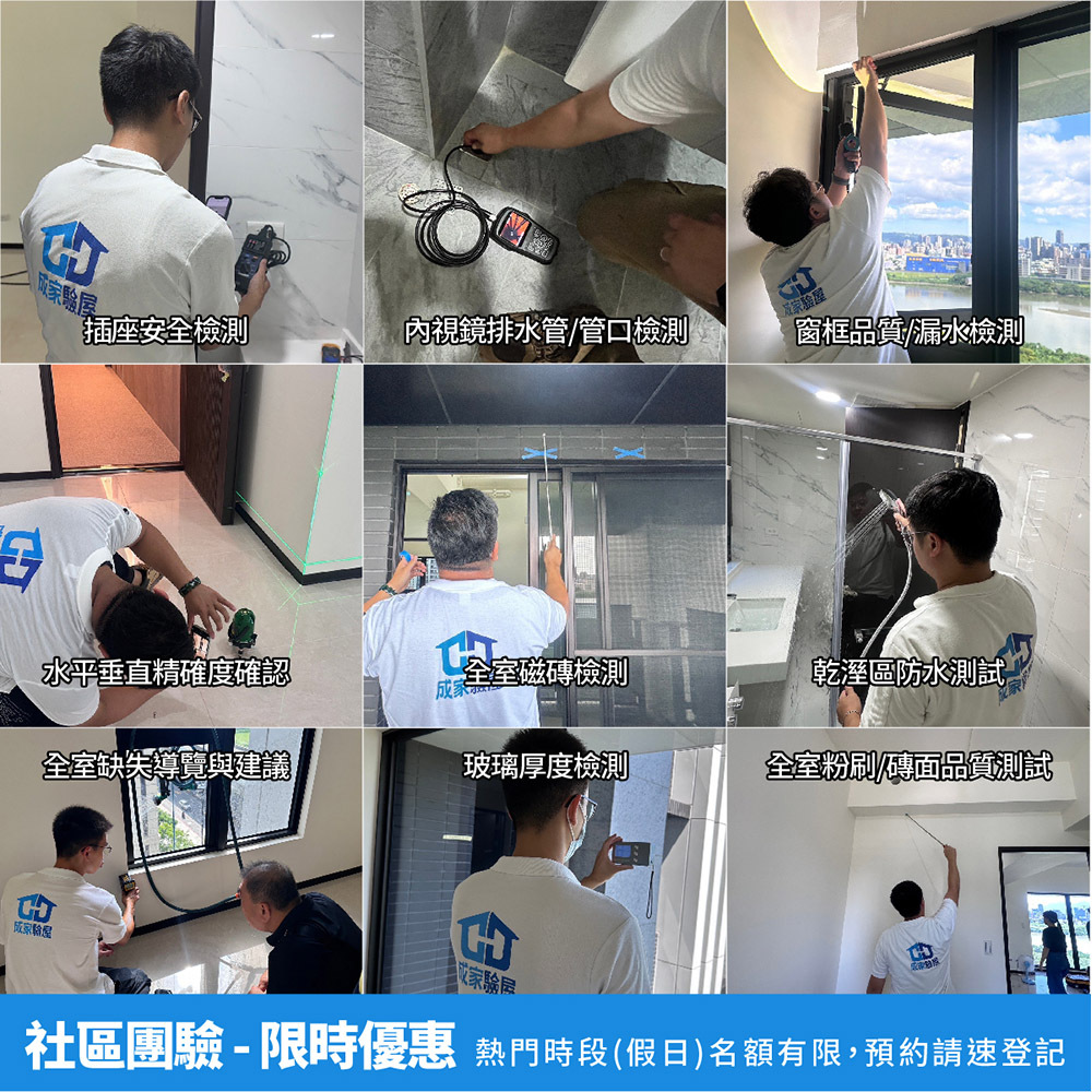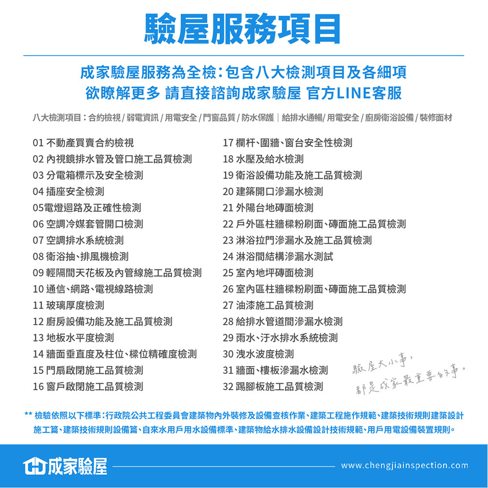 1. 包含八大檢測項目:合約檢視/弱電資訊/用電安全/門窗品質/防水保護|給排水通暢/用電安全/廚房衛浴設備/裝修面材及各細項。