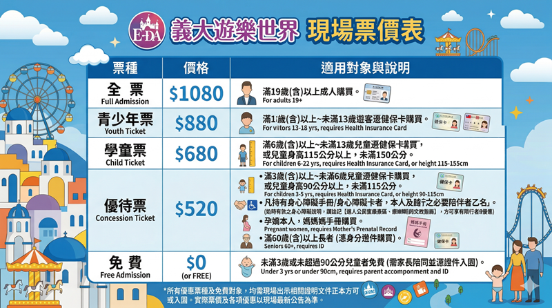 3. 為了您的安全,部份遊樂設施限制身高、老人、孕婦、心臟疾病及骨質異常等患者使用,請參考遊園手冊並以現場設施公告為準。