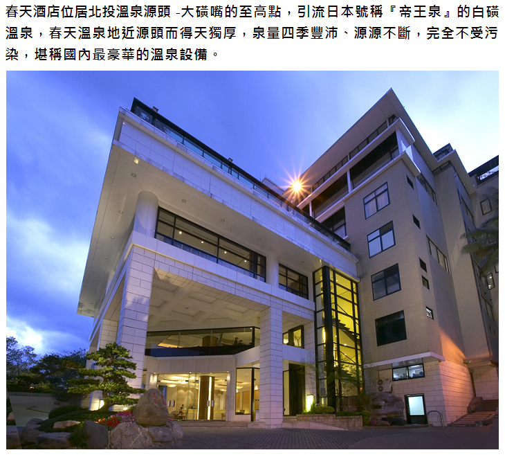 春天酒店溫泉水由臺北市自來水事業處接管提供,定期接受衛生局水質檢測合格,且通過安心湯屋認證,在春天泡湯更是安心。