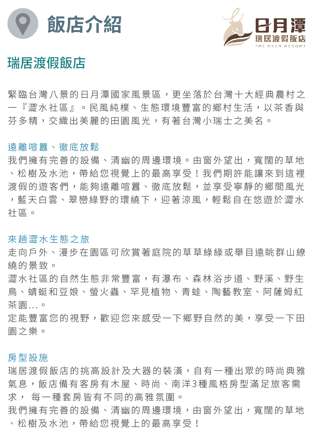 瑞居渡假飯店緊臨台灣八景的日月潭國家風景區,更坐落於台灣十大經典農村之一『澀水社區』。民風純樸、生態環境豐富的鄉村生活,以茶香與芬多精,交織出美麗的田園風光,有著台灣小瑞士之美名。