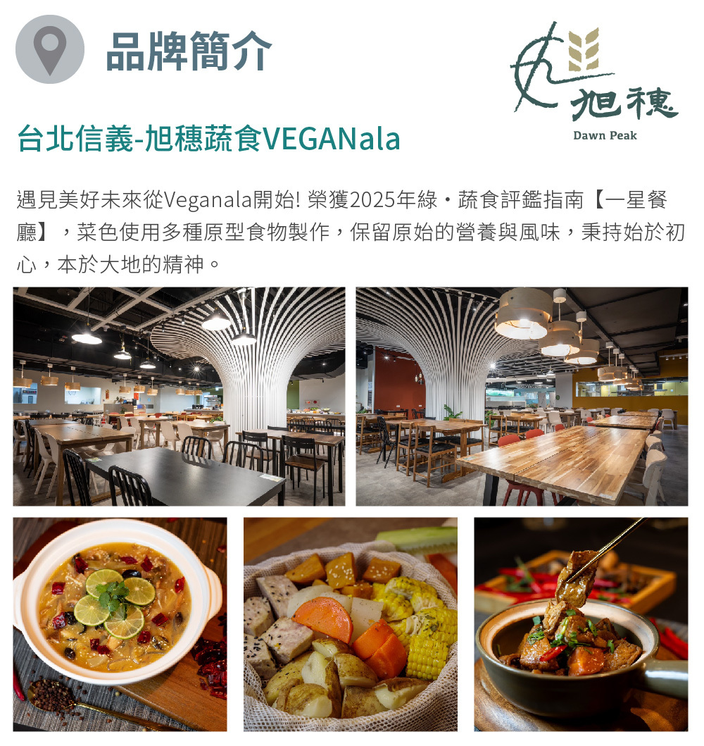 1. 本券限二人於台北信義【旭穗蔬食VEGANala】平日午餐使用乙次。