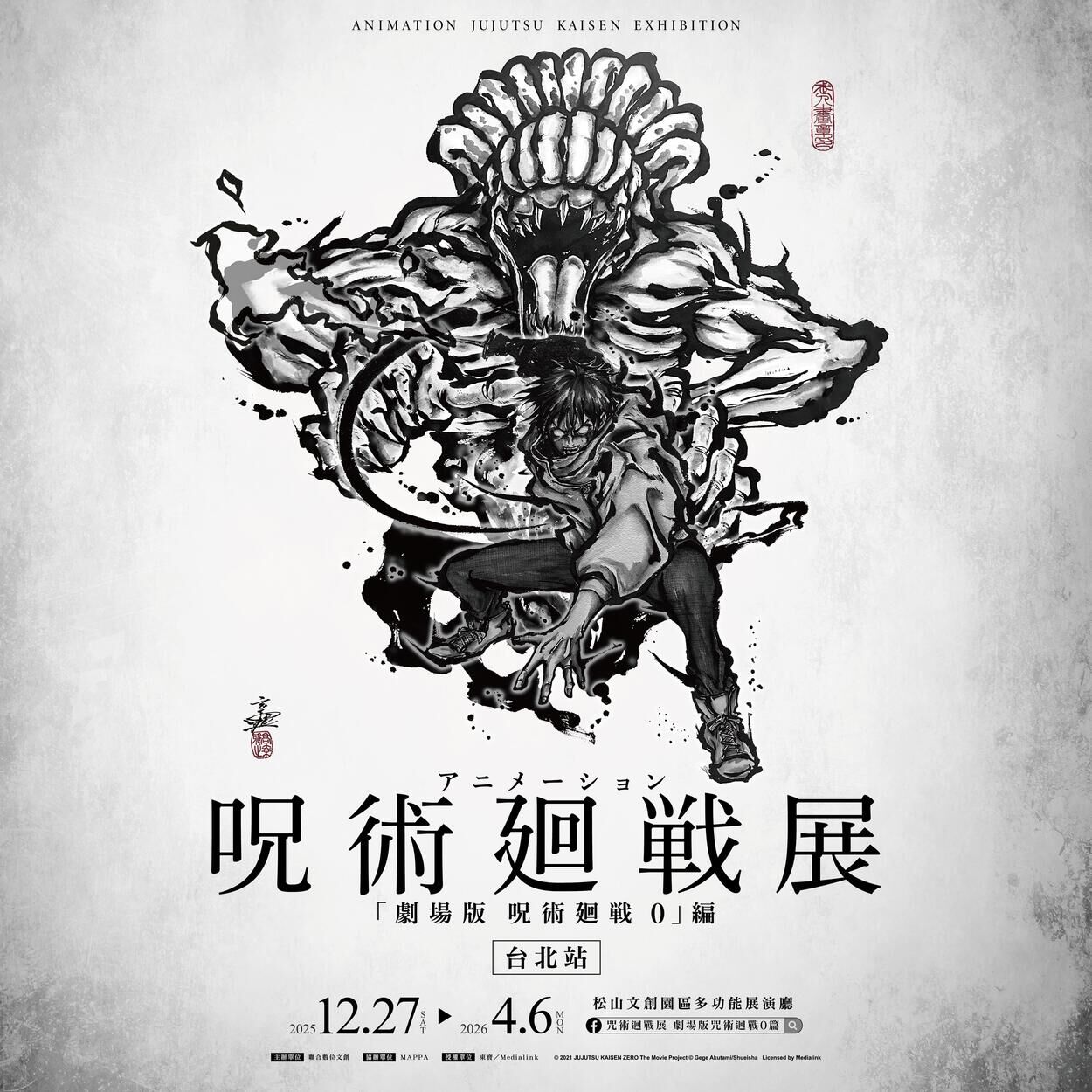 粉絲們將親臨咒力滿載的世界,近距離欣賞劇場版的珍貴幕後創作資料、「最強咒術師」五條悟1:1模型與多款咒具神還原展示,更特別的是,展覽更加碼展出動畫第1季與第2季「懷玉・玉折」篇的精彩內容,同時也邀請到日本知名水墨畫家こうじょう雅之(Kojo_masayuki),以獨樹一幟的筆墨技法重新詮釋角色風貌,帶來與動畫、漫畫截然不同的視覺震撼體驗,粉絲絕不可錯過。