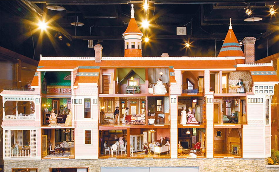 袖珍博物館裡收藏的第一件大型娃娃屋作品。作者Reginald Twigg於1988年開始著手打造,共花了四年多的時間完成這件作品!除了房屋的精細程度令人讚嘆不已,它更是360度都可以觀看的作品喔! 從前方看是一座氣派的大豪宅,到後方就可以看到屋裡20幾間的房間,各自都有不同的設計!每個房間的傢俱、壁畫、地毯、燈飾、陶瓷、花草以及瓶瓶罐罐等,都源自不同專業藝術家的嘔心傑作,是結合多位作家的精華共同完成!