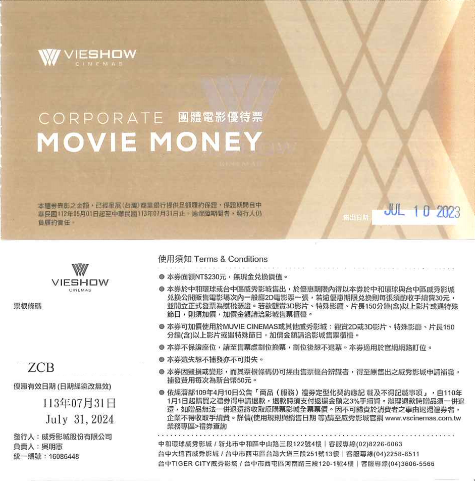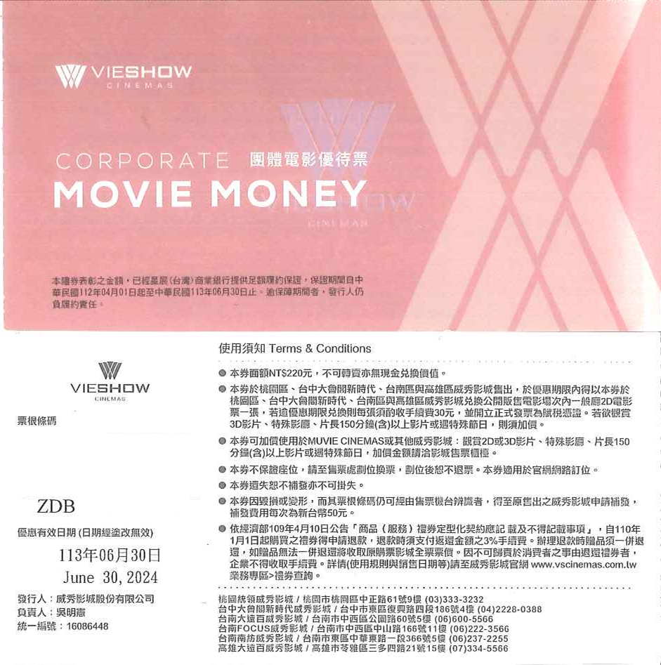 適用於台灣各區域威秀影城(惟至MUVIECINEMAS 須另加價),網路訂位代碼ydb