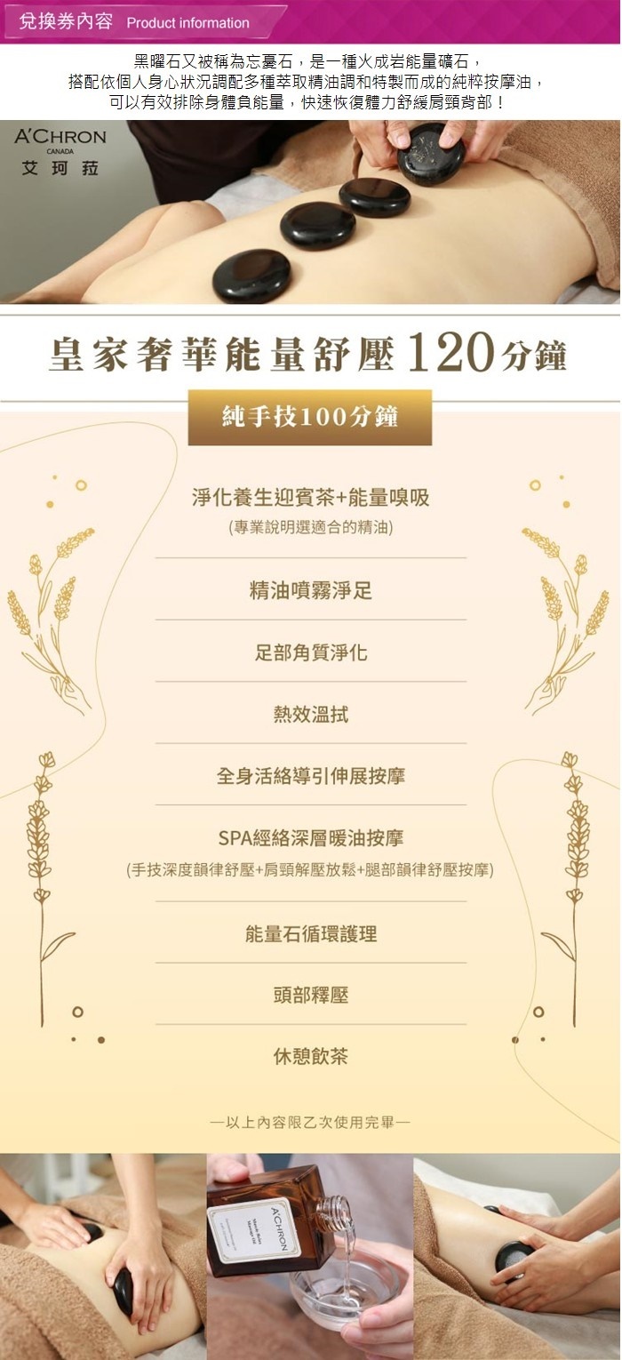 1.單張可1人於《A'Chron艾珂菈》使用皇家奢華能量舒壓120分鐘(純手技100分鐘)乙次。