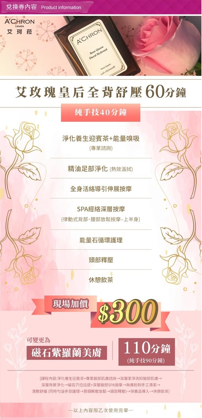 1.單張可1人於《A'Chron艾珂菈》使用艾玫瑰皇后全背舒壓60分鐘(純手技40分鐘) 乙次。