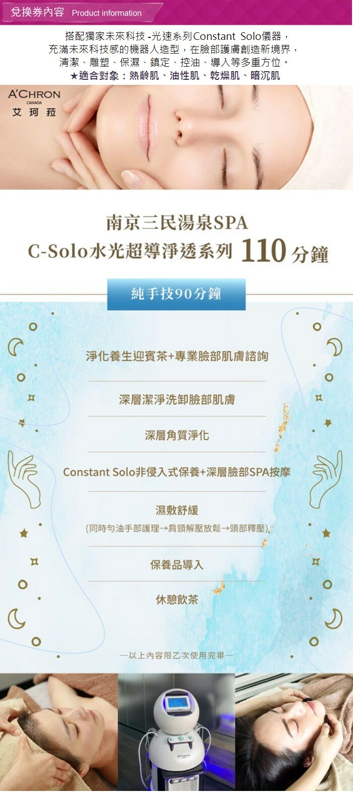 1.單張可1人於《A'Chron艾珂菈南京三民-湯泉SPA》使用C-Solo水光超導淨透系列110分鐘(純手技90分鐘) 乙次。