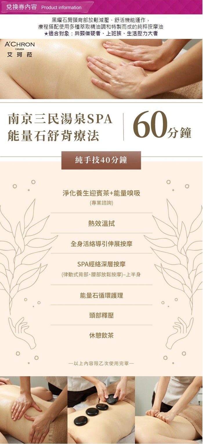 1.單張可1人於《A'Chron艾珂菈南京三民湯泉SPA》使用能量石舒背療法60分鐘(手技40分鐘) 乙次。
