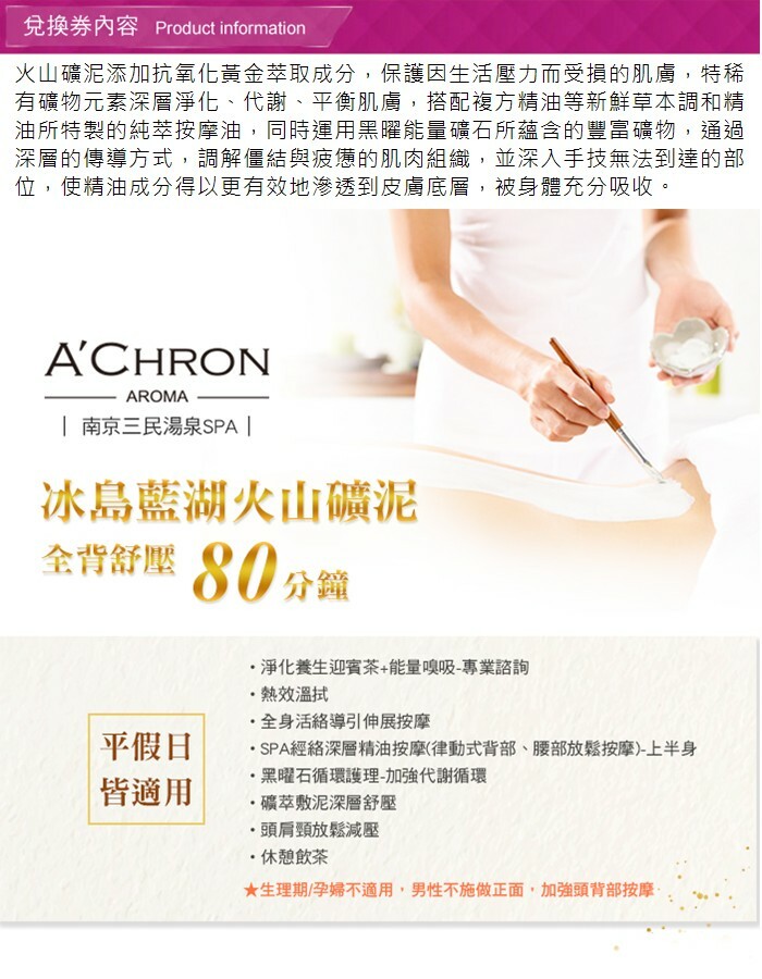 單張可1人於《A'Chron艾珂菈南京三民湯泉SPA》使用冰島藍湖火山礦泥全背舒壓80分鐘(手技60分鐘)乙次。★生理期/孕婦不適用
