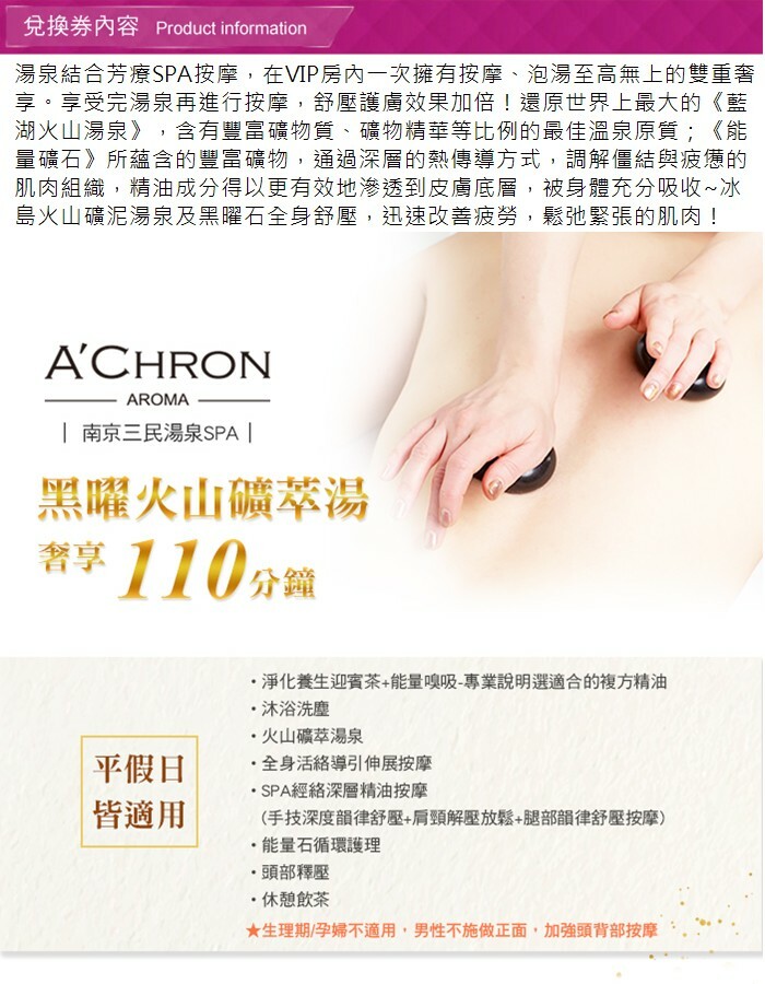 單張可1人於《A'Chron艾珂菈南京三民湯泉SPA》使用黑曜火山礦萃湯奢享110分鐘(湯泉30分鐘、手技60分鐘)乙次。★生理期/孕婦不適用