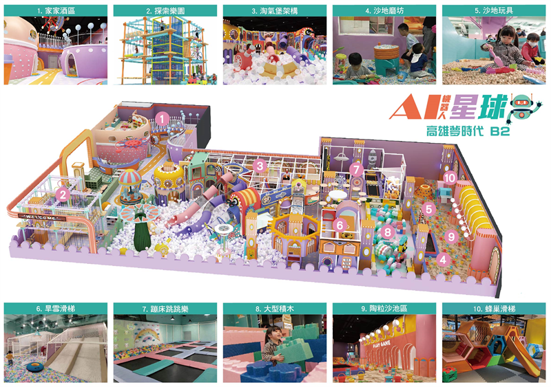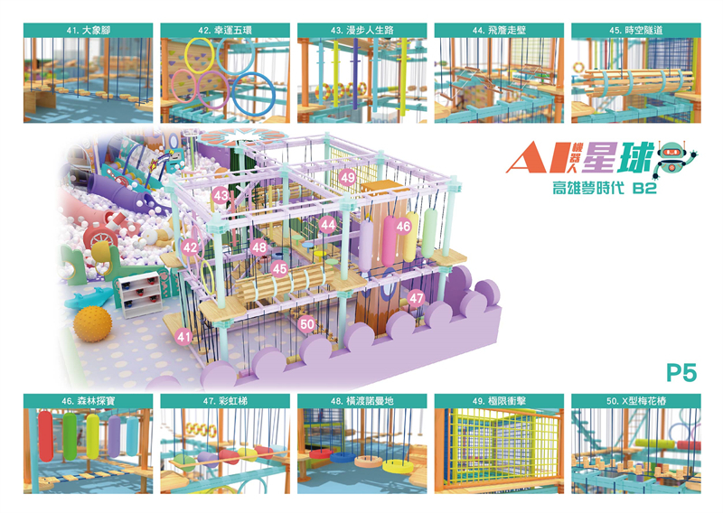 4. 設施包含巔峰時刻、橫渡諾曼地、飛簷走壁、獨步天下、曲折人生、過關斬將、時空隧道、梅花樁、圓形踏踏板、彩虹爬梯、幸運五連環、極限衝擊、無敵滾筒、漫步人生路、獨木橋、大腳踏板、拳擊闖關等。