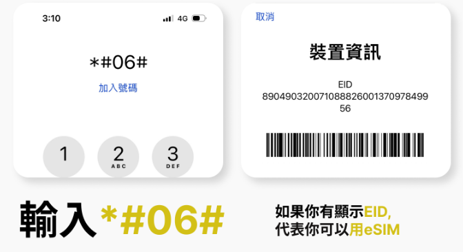 用撥號按鍵撥打「*#06#」,如出現 EID 的條碼或文字,表示您的手機支援 eSIM 功能。