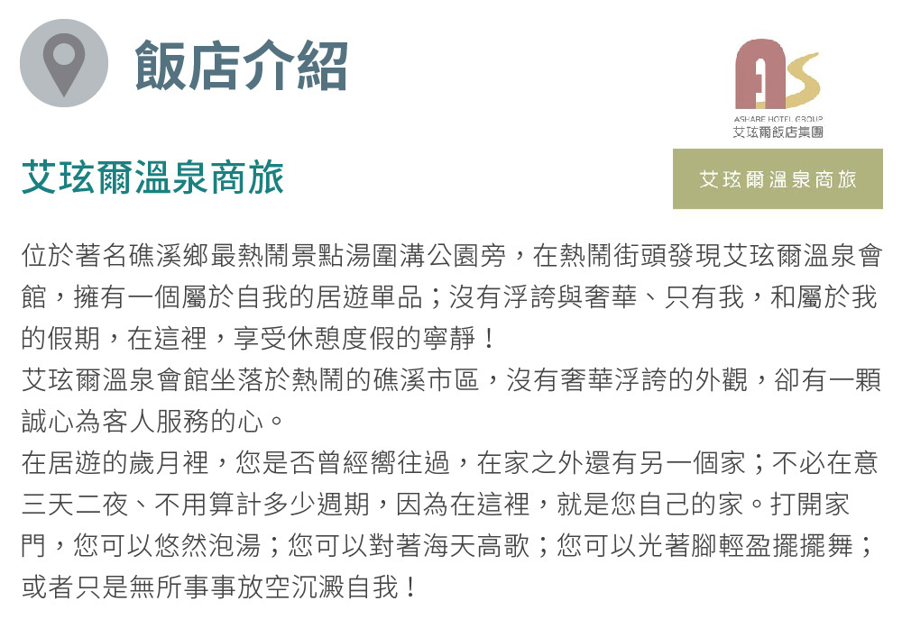 位於著名礁溪鄉最熱鬧景點湯圍溝公園旁,在熱鬧街頭發現艾玹爾溫泉商旅,擁有一個屬於自我的居遊單品;沒有浮誇與奢華、祇有我,和屬於我的假期,在這裡,享受休憩度假的寧靜!