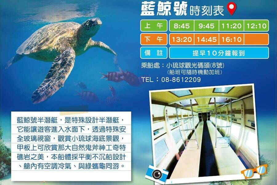 小琉球觀光海底玻璃船"迄今已經營五十年,藍鯨號半潛艇船體採平衡不沉船設計,也為特殊設計的半潛艇,可讓遊客進入水面下,透過特殊安全玻璃視窗觀賞小琉球海底景觀,且艙內有空調冷氣,欣賞海底世界同時與綠蠵龜同遊,而甲板上可欣賞那大自然鬼斧神工奇特礁岩之美!