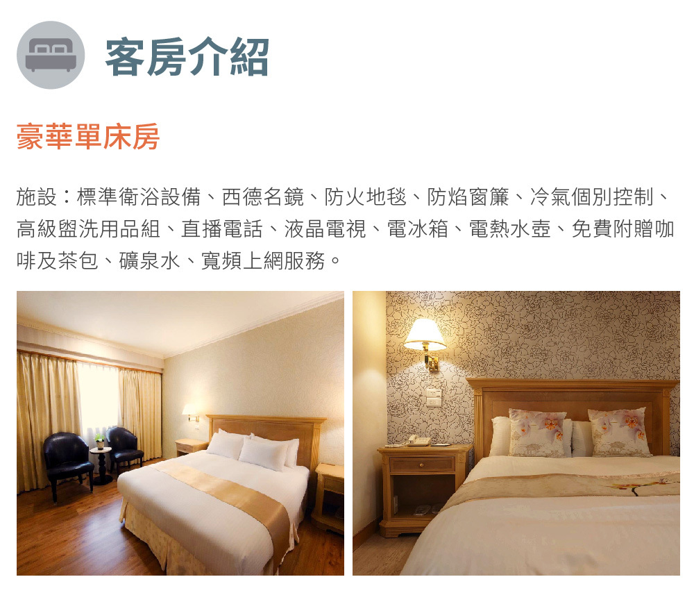 3.房型為豪華單床房(ㄧ大床);若是合併使用四人房,房型為豪華四人房。