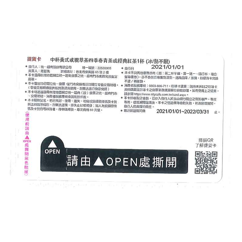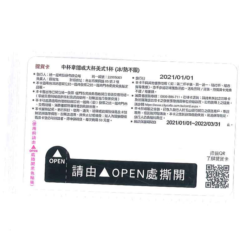 3.本卡售出時已開立統一發票,至門市兌換商品時開立零值交易明細。(零值交易明細僅供核對及退貨使用,恕無法進行發票兌獎)。