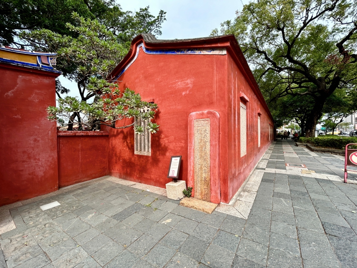 大成坊左壁間嵌有「下馬碑」迎向來人。坊側有牆環廟,牆高色紅,孔子是周朝人,當代崇尚赤色,冠服宮室皆飾以高貴的紅色,孔子廟圍牆也是如此。