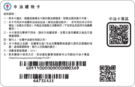 3.持本卡消費時,應向加油員出示禮物卡交易條碼。交易完成後,請務必確認簽單交易金額及餘額是否正確再行離開,以保障持卡人權益。