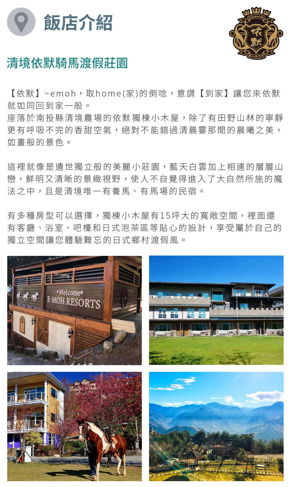 【依默】~emoh,取home(家)的倒唸,意謂【到家】讓您來依默就如同回到家一般。座落於南投縣清境農場的清境依默騎馬渡假莊園,除了有田野山林的寧靜,更有呼吸不完的香甜空氣。在一片綠色地毯搭配雲霧繚繞中,依默獨棟小木屋會讓您享受到真正的寧靜。難得來山上,記得別睡得太晚,會錯過剎那的晨曦之美。