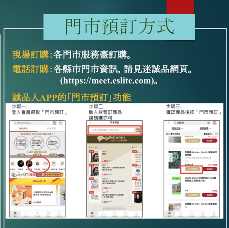 ➣ 誠品禮券除可於誠品實體店購物時使用,另得以「門市預訂」方式進行訂購。「門市預訂」可通過「門市現場訂購」、「電話致電門市訂購」及「誠品人APP中的門市預訂方式,再至門市取貨付款(以現金或禮券支付)。