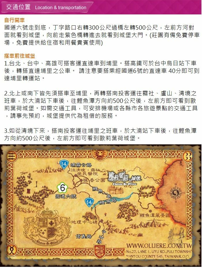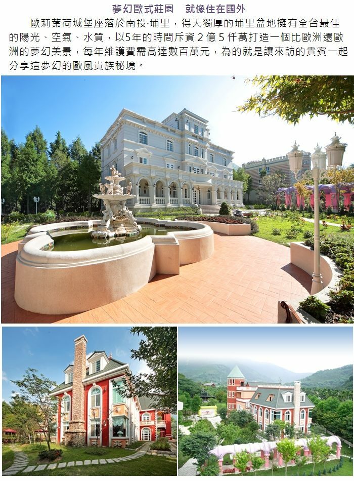 歐莉葉荷城堡座落於南投‧埔里,得天獨厚的埔里盆地擁有全台最佳的陽光、空氣、水質,以5年的時間斥資2億5仟萬打造一個比歐洲還歐洲的夢幻美景,每年維護費需高達數百萬元,為的就是讓來訪的貴賓一起分享這夢幻的歐風貴族秘境。