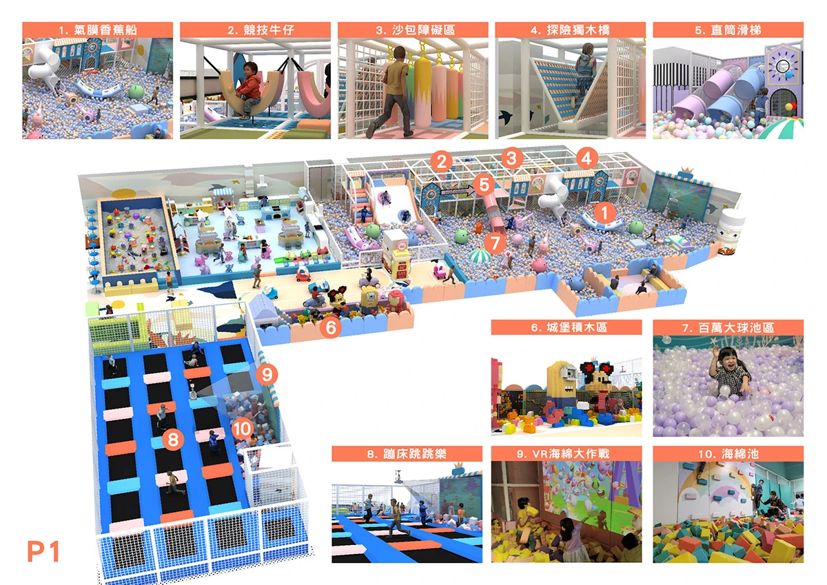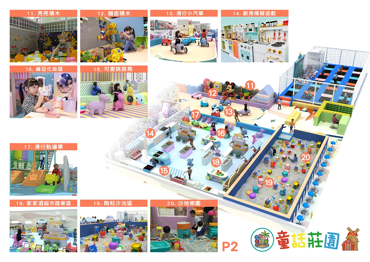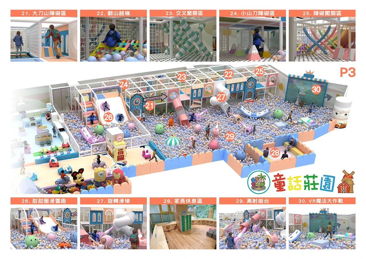 3.設施包含百萬大球池、高射砲台、闖關大挑戰、超級香蕉船、橡皮艇球海大冒險、魔法VR大作戰、繩網迷宮(交叉闖關區、翻山越嶺、小刀山障礙區、探險獨木橋、沙包闖關區、競技牛仔)、彩球天降、 等。