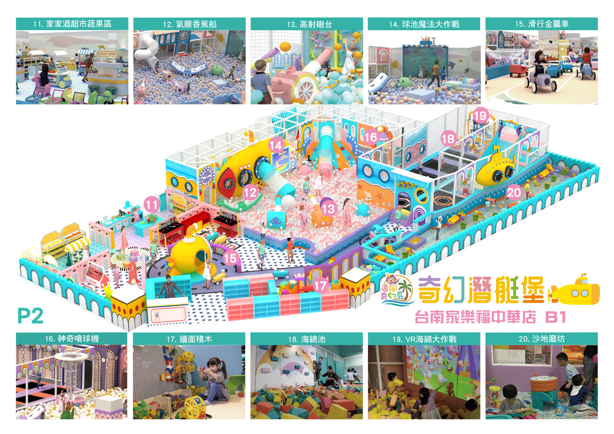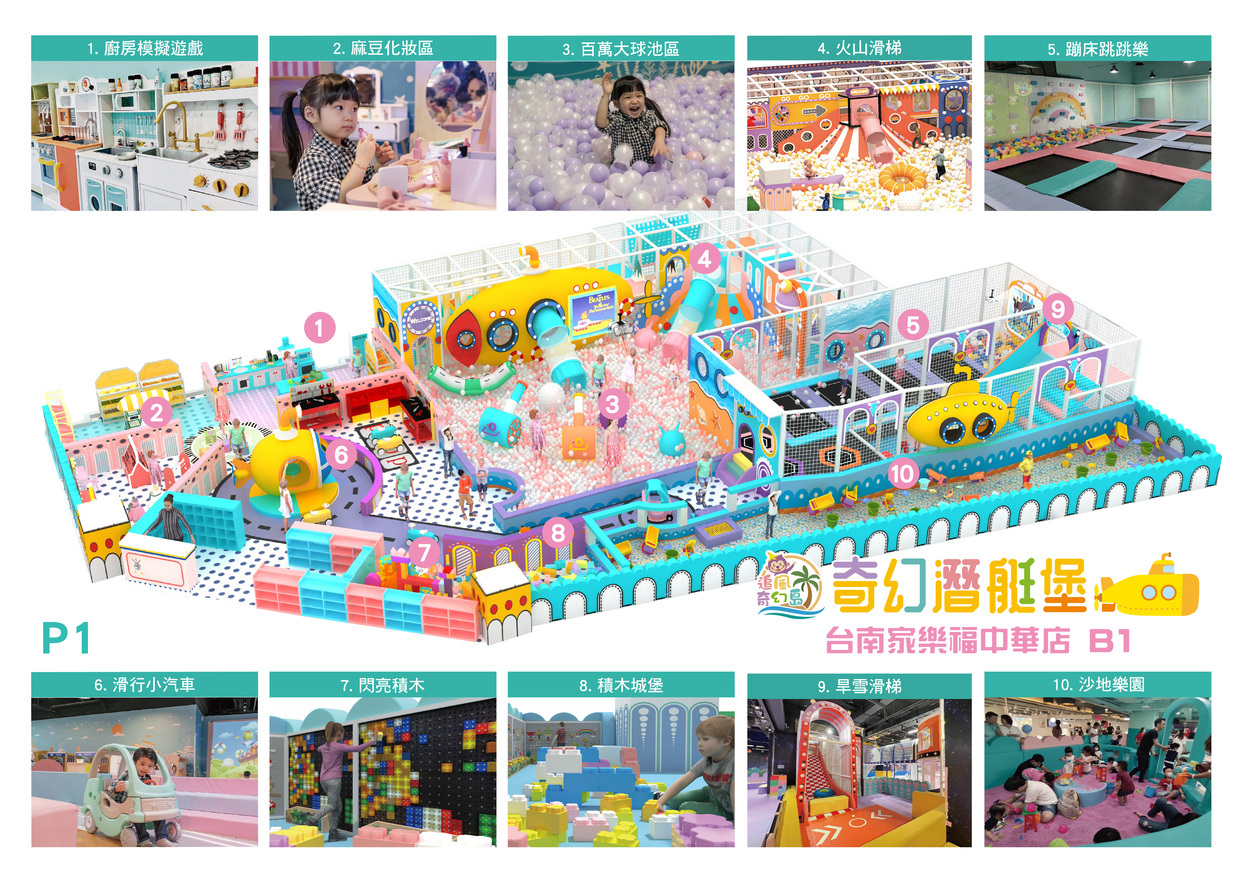 1、每張票券可一大一小全區全日𣈱玩台南家樂福中華店 【奇幻潛艇堡】(六歲以下需全程陪同一位大人入場)。