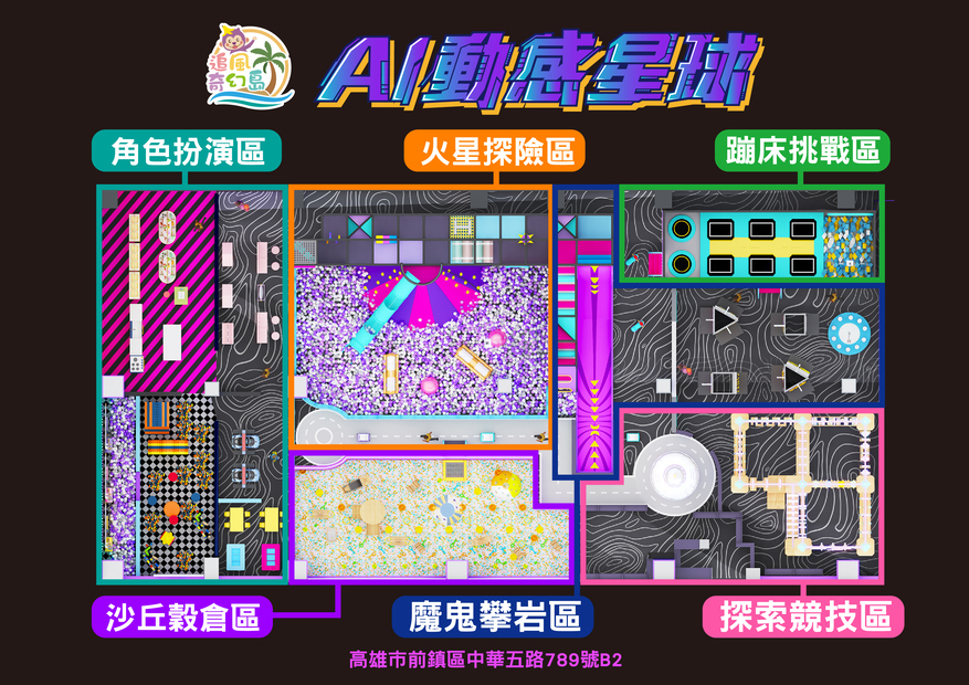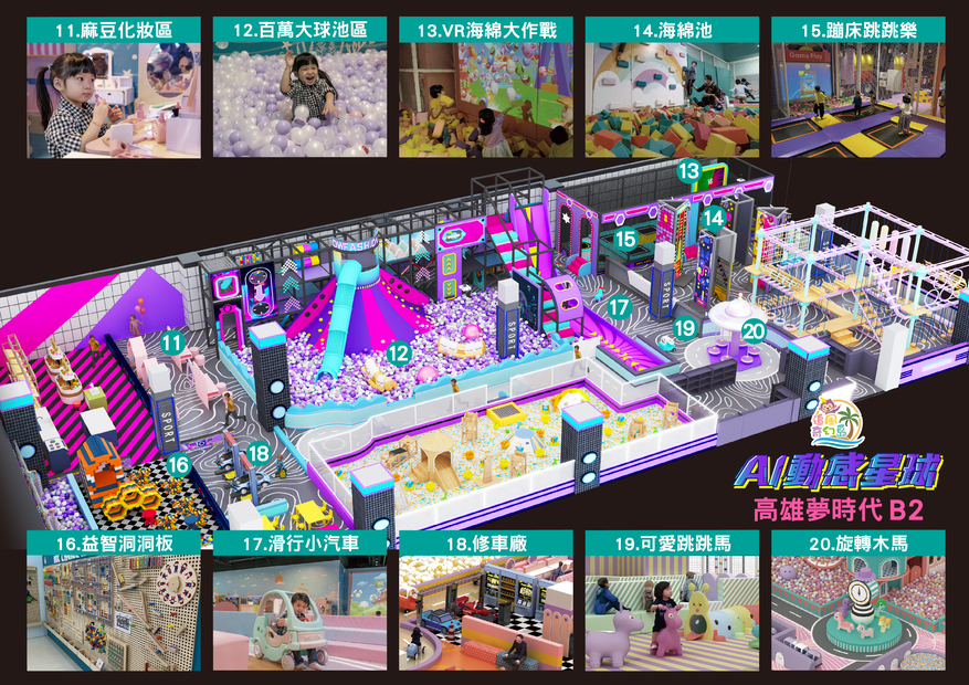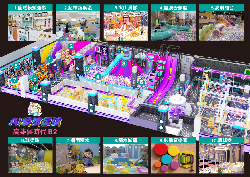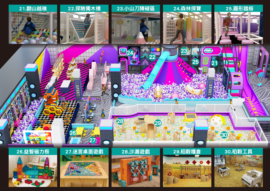 🧗♂ 繩網迷宮(交叉闖關區、翻山越嶺、小刀山障礙區、探險獨木橋、沙包闖關區、競技牛仔⋯) 🛝 隧道大滑梯、🌋 火山攀爬 🎈 百萬大球池 🥀 仙女散花 🚀 高射砲台 🍌 超級香蕉船 🚣♀ 橡皮艇球海大冒險 🕹 魔法VR大做戰