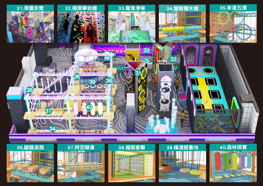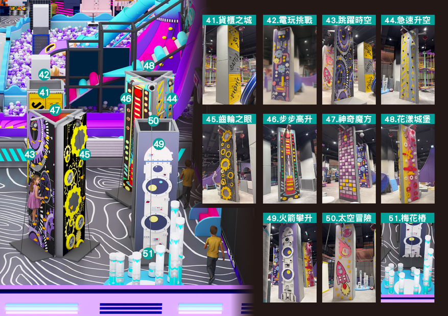 各式不同的攀岩挑戰 梅花樁、貨櫃之城、電玩挑戰、跳躍時空、極速升空、齒輪之眼、步步高升、神奇魔方、花漾城堡、火箭攀升、太空冒險