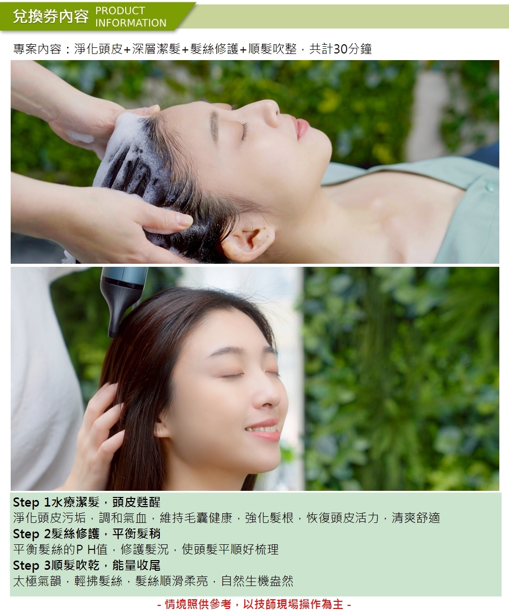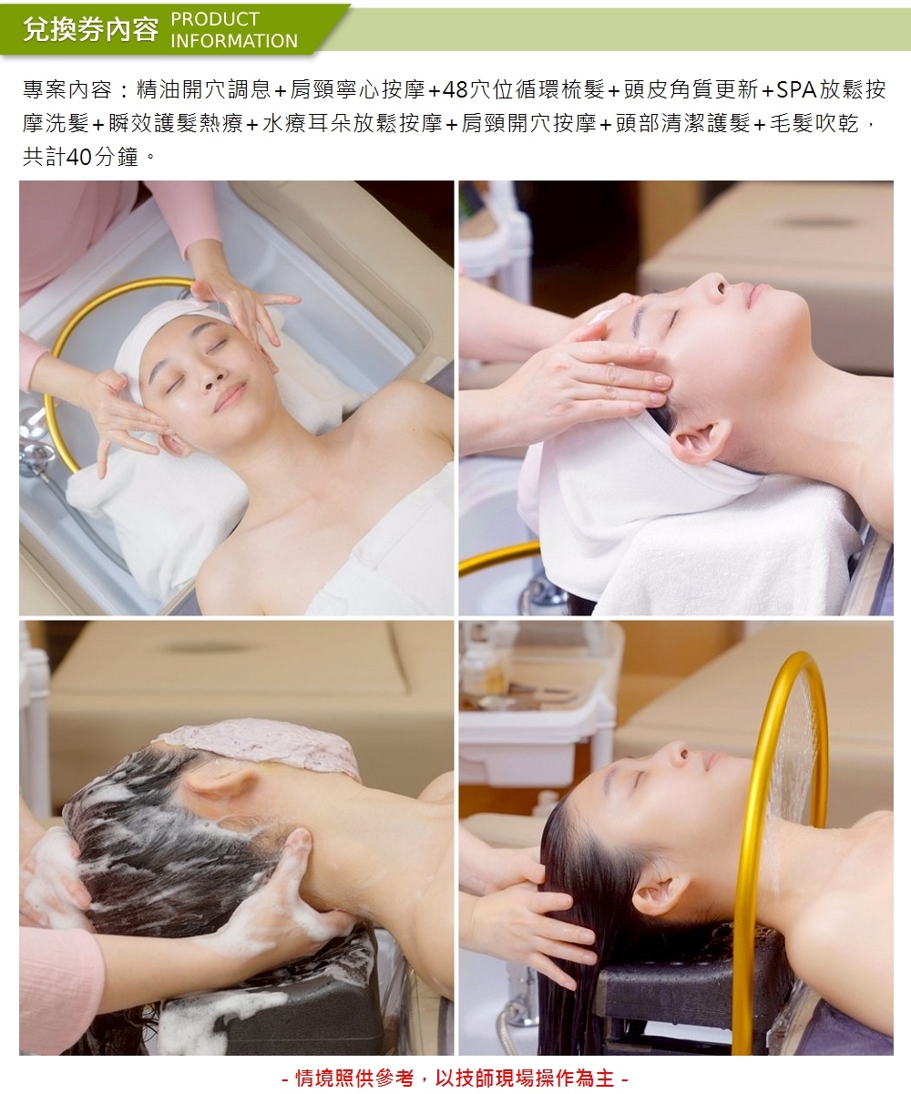內容:選用專屬髮品+肩頸寧心按摩+手部舒緩按摩+漫活釋壓洗髮+頭刮+淋巴引流八部曲+瞬效滋養修護+顱部水癒潔淨+毛鱗順髮吹風,共計40分鐘。