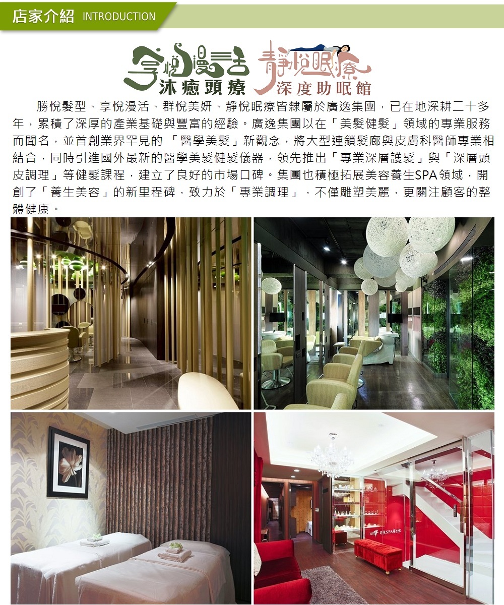 單張可1人於《勝悅髮型/享悅漫活》各分店兌換無極釋壓SPA課程乙次或於《群悅美妍/靜悅眠療》各分店兌換深度助眠SPA課程乙次,加贈法比娜洗髮精500ml乙瓶。