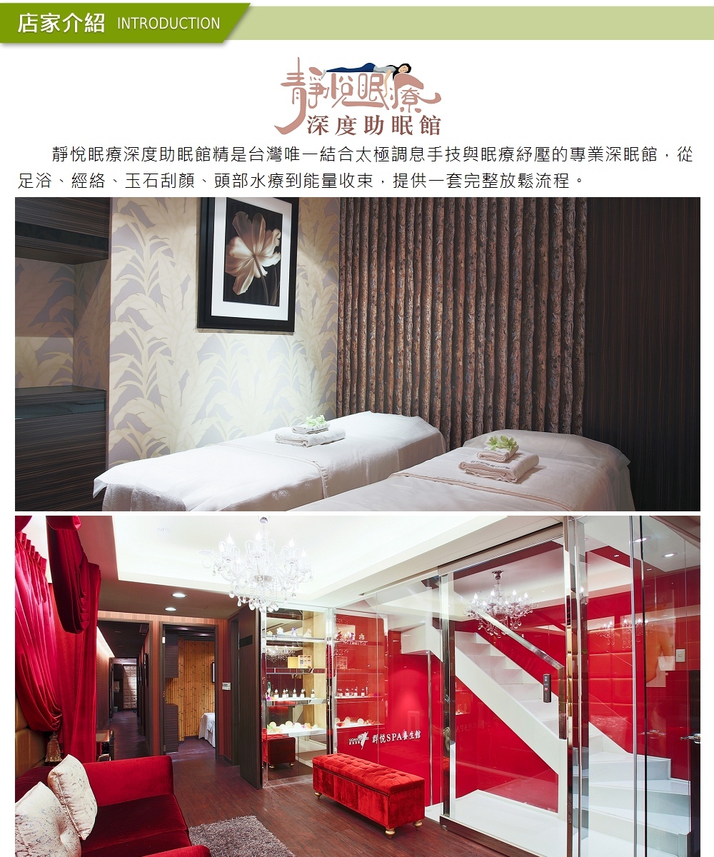 ※深度助眠課程:足浴暖身+背部及腿部按摩放鬆+頭部按摩放鬆+腿部舒緩按摩+芳香精油嗅吸放鬆+肩頸放鬆按摩+頭部舒緩按摩+臉部保濕面膜+頭部玉石刮療+淨化頭皮+順髮吹整,共計100分鐘。