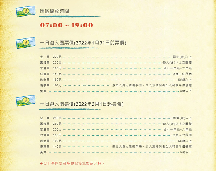 (1)入園全票1張(國中(含)以上大人)。