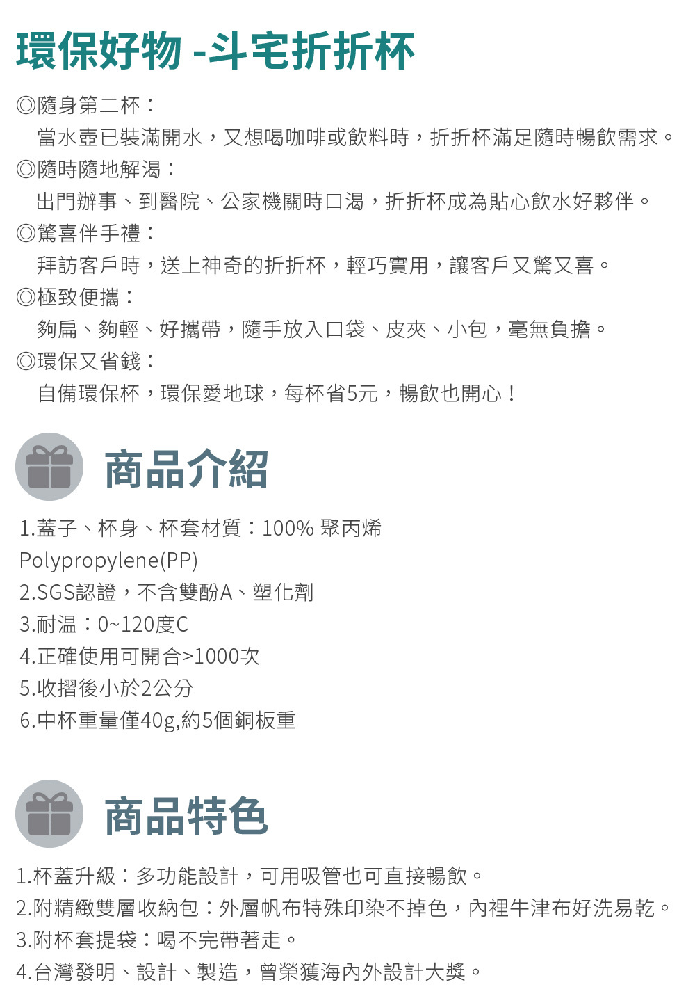1.斗宅折折杯:輕便、易攜、易清洗、不留味。