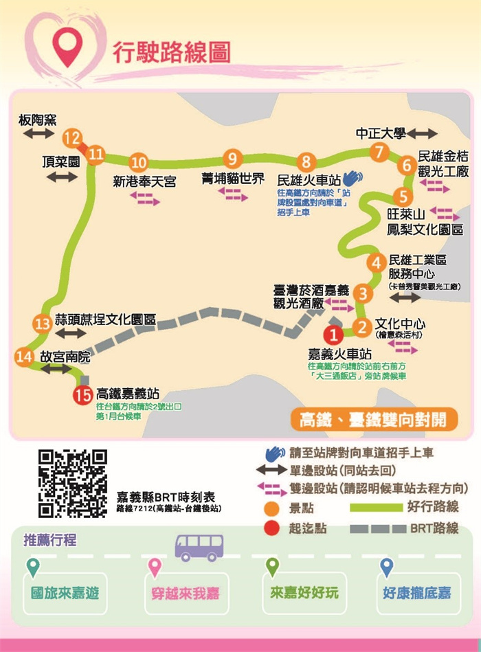 ●台灣好行故宮南院線:以日本東京JR山手線為借鏡,透過環狀線概念串起大嘉義平原地區文化、觀光及產業景點設施;有國際級亞洲藝術薈萃的故宮南院、在地農村鄉土藝術、樂活悠閒自行車道、新港及民雄魅力商圈、以及拍照熱點彩繪村、新奇創意觀光工廠等15個站點。透過無縫隙旅遊服務,引領您暢遊嘉義市區熱門旅遊景點。