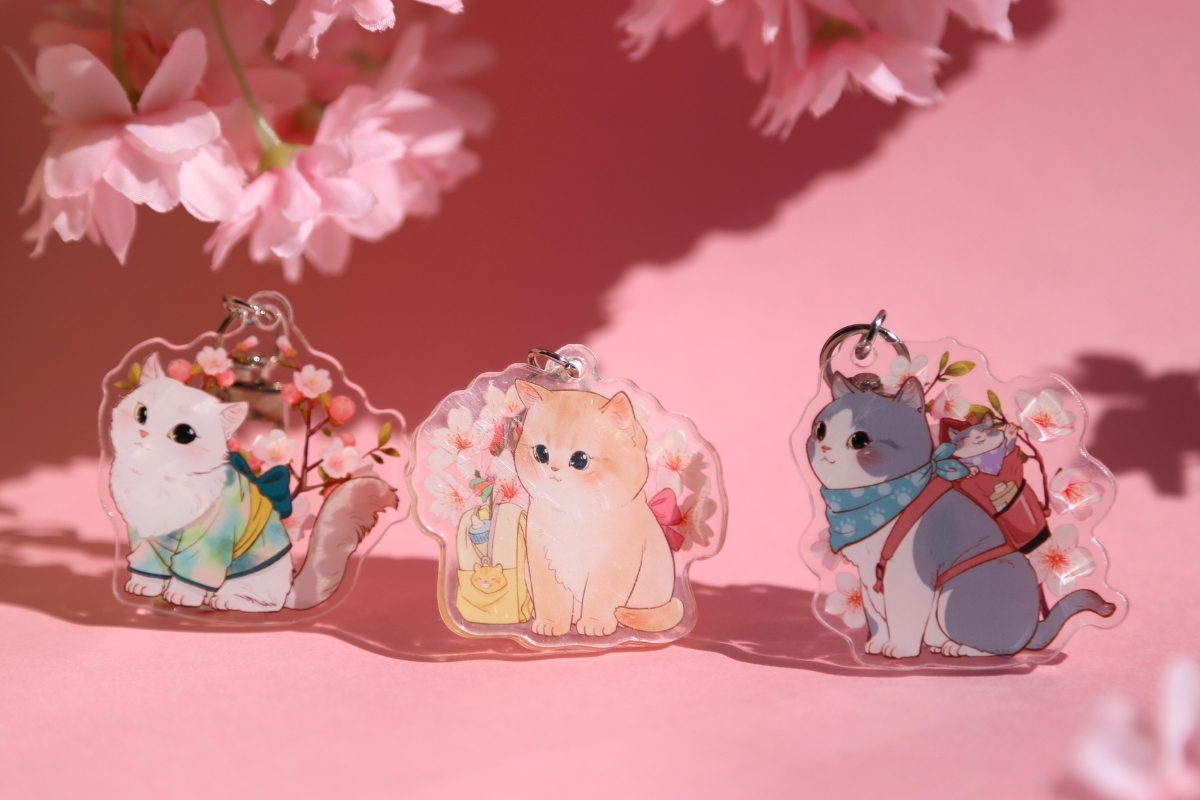 三款櫻花貓造型吊飾,由文創繪師「我紙在乎你」巧妙筆下誕生的櫻花喵,共有三隻可愛又生動的喵星人,駐進九族文化村啦!