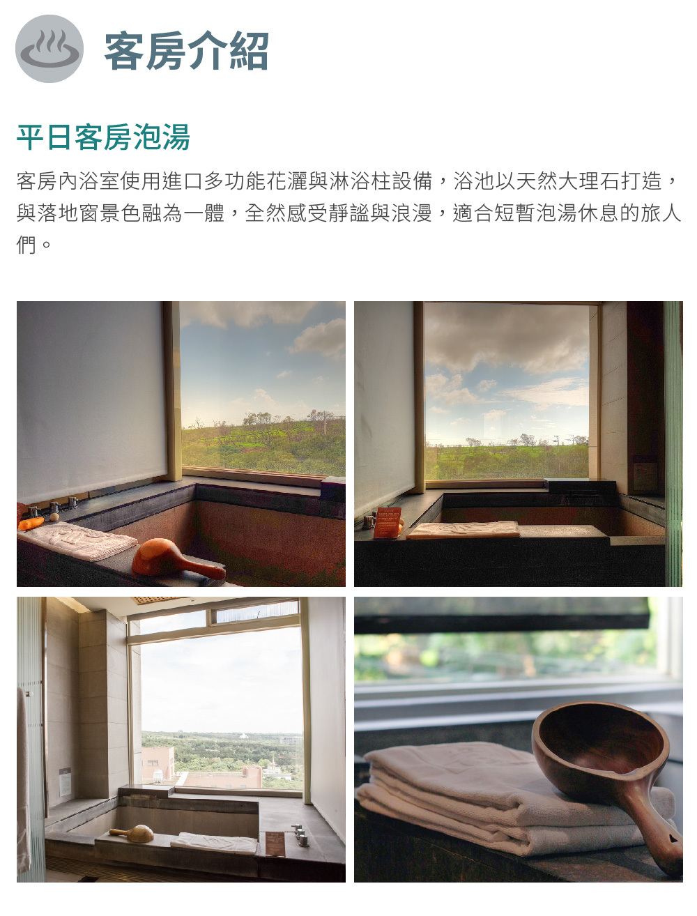 5. 客房泡湯適用房型:清新雙人房、適用2人,可加人加價NT$500,每房最多4人使用。