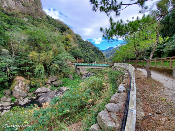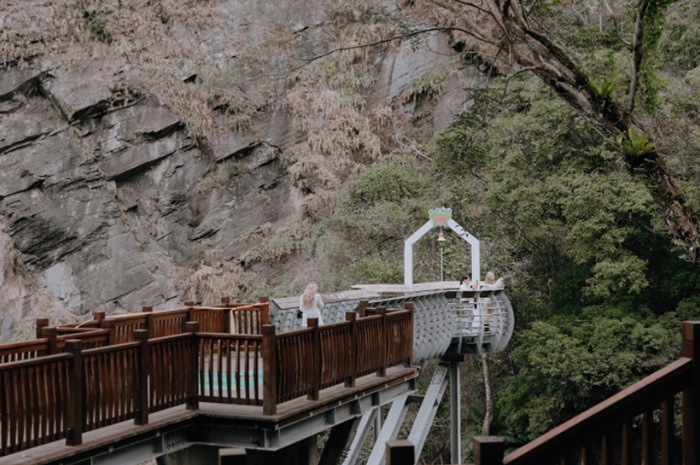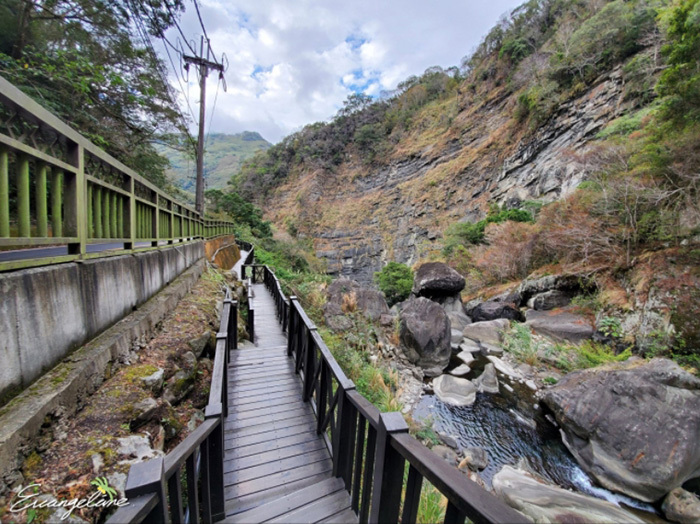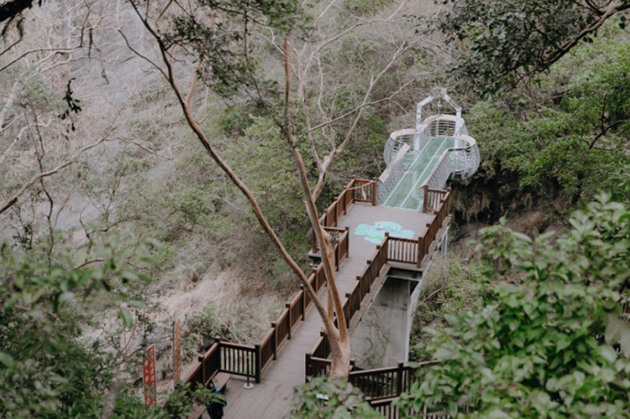 步道盡頭有一座懸空的玻璃彩虹步道,底下是那羅溪的河道溪谷,由彩虹步道上望出去,那羅溪谷的巨大峭壁上湍急的瀑布奔流而下,壯觀的奇景相當令人震撼!