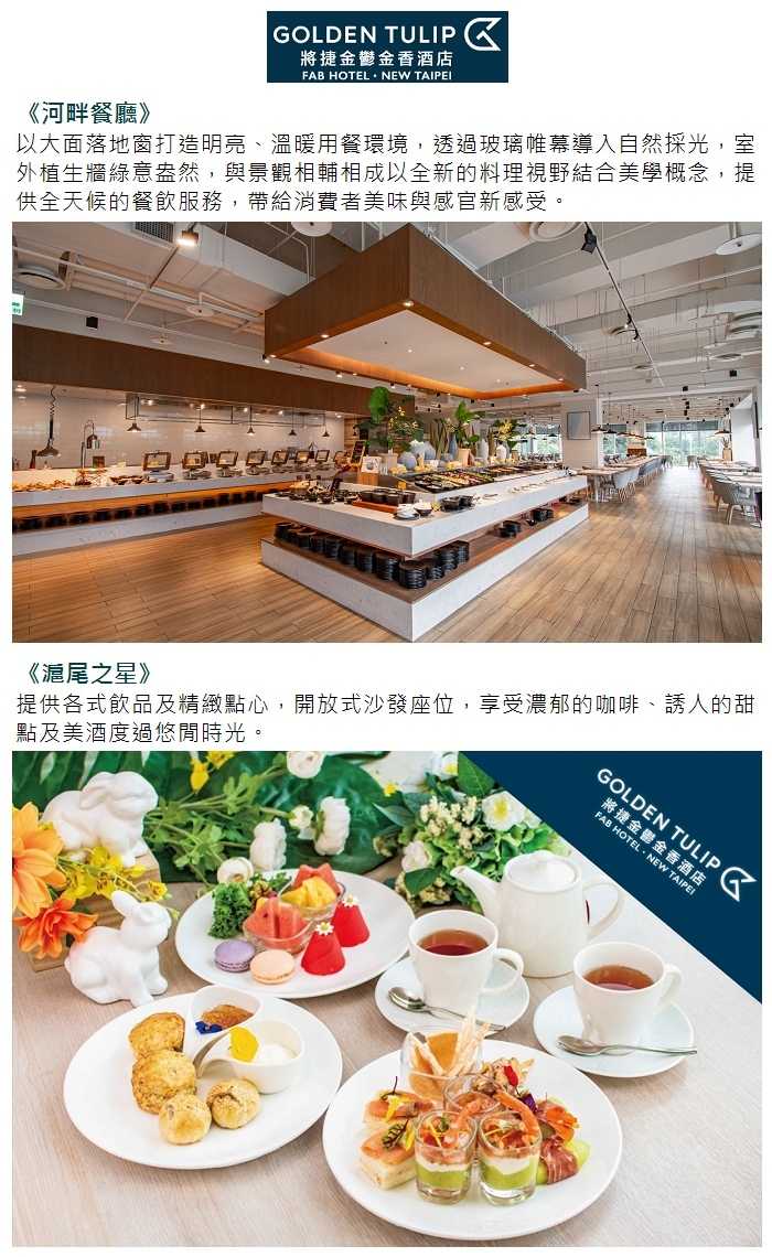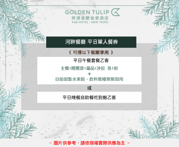 1.單張可1人於《淡水將捷金鬱金香酒店-河畔餐廳》享平日午餐套餐(定價$980+10%)乙客或平日晚餐自助餐吃到飽乙客。(已含服務費)