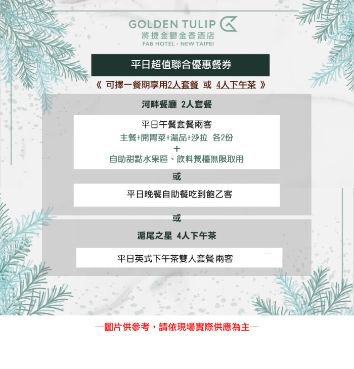 1.單張可2人於《淡水將捷金鬱金香酒店-河畔餐廳》享平日午餐套餐(定價$980+10%)兩客或平日晚餐自助餐兩客;單張可4人於《淡水將捷金鬱金香酒店-滬尾之星》享平日英式下午茶雙人套餐兩客。(已含服務費)