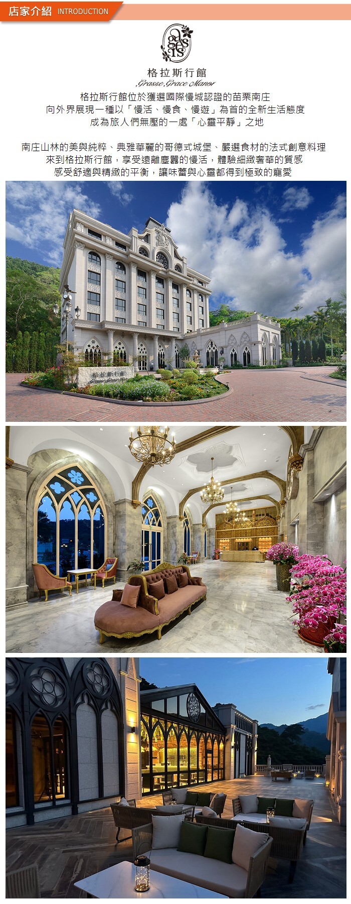 以法國香水之都為名的「格拉斯行館」,擁有浪漫優雅的哥德式風格建築,處處展現著精湛的工藝和美學,不論是細膩精緻的雕花、迷人綠意的窗景、或是古典挑高的穹頂,都讓人驚嘆不已。於此渡過的一泊二食饗宴,彷彿置身於一場華麗又溫柔的南法夢境,讓人捨不得夢醒。我在這享受慢活、慢食、慢遊,踏入南庄後時間都緩了下來,也讓我的心靈得到富足與平靜,準備好迎接新的挑戰。