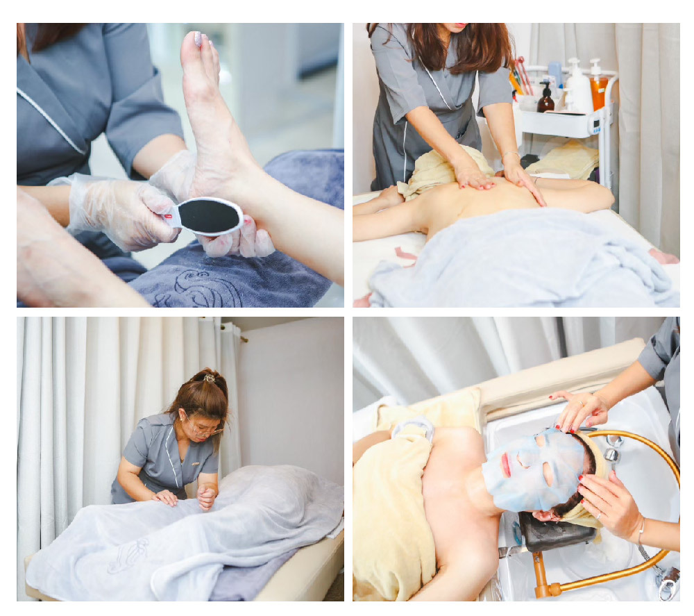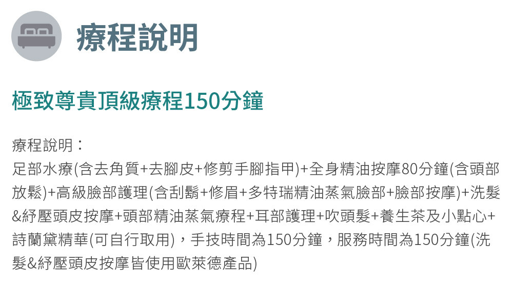 足部水療(含去角質+去腳皮+修剪手腳指甲)+全身精油按摩80分鐘(含頭部放鬆)+高級臉部護理(含刮鬍+修眉+多特瑞精油蒸氣臉部+臉部按摩)+洗髮&紓壓頭皮按摩+頭部精油蒸氣療程+耳部護理+吹頭髮+養生茶及小點心+詩蘭黛精華(可自行取用),手技時間為150分鐘,服務時間為150分鐘(洗髮&紓壓頭皮按摩皆使用歐萊德產品)
